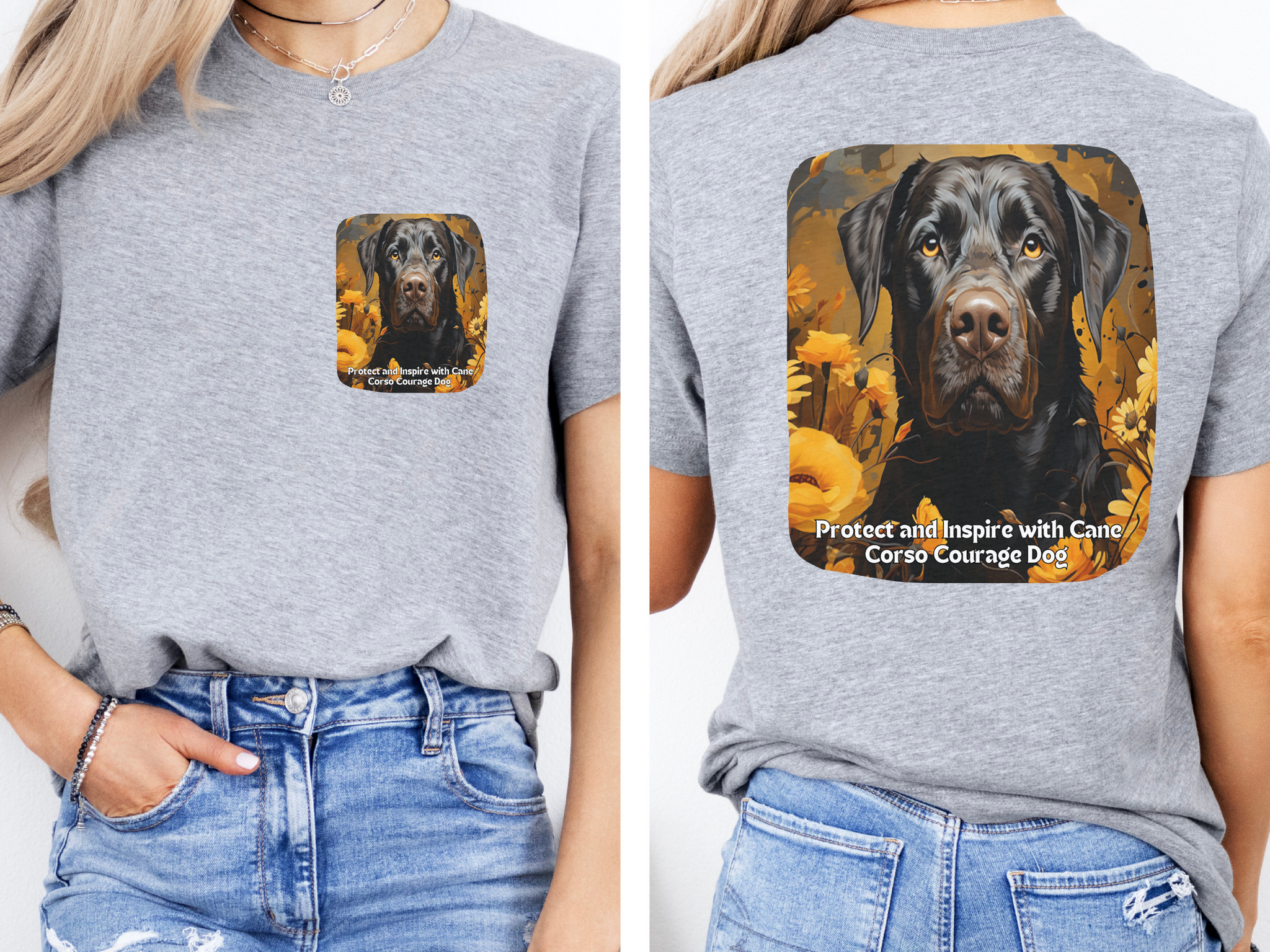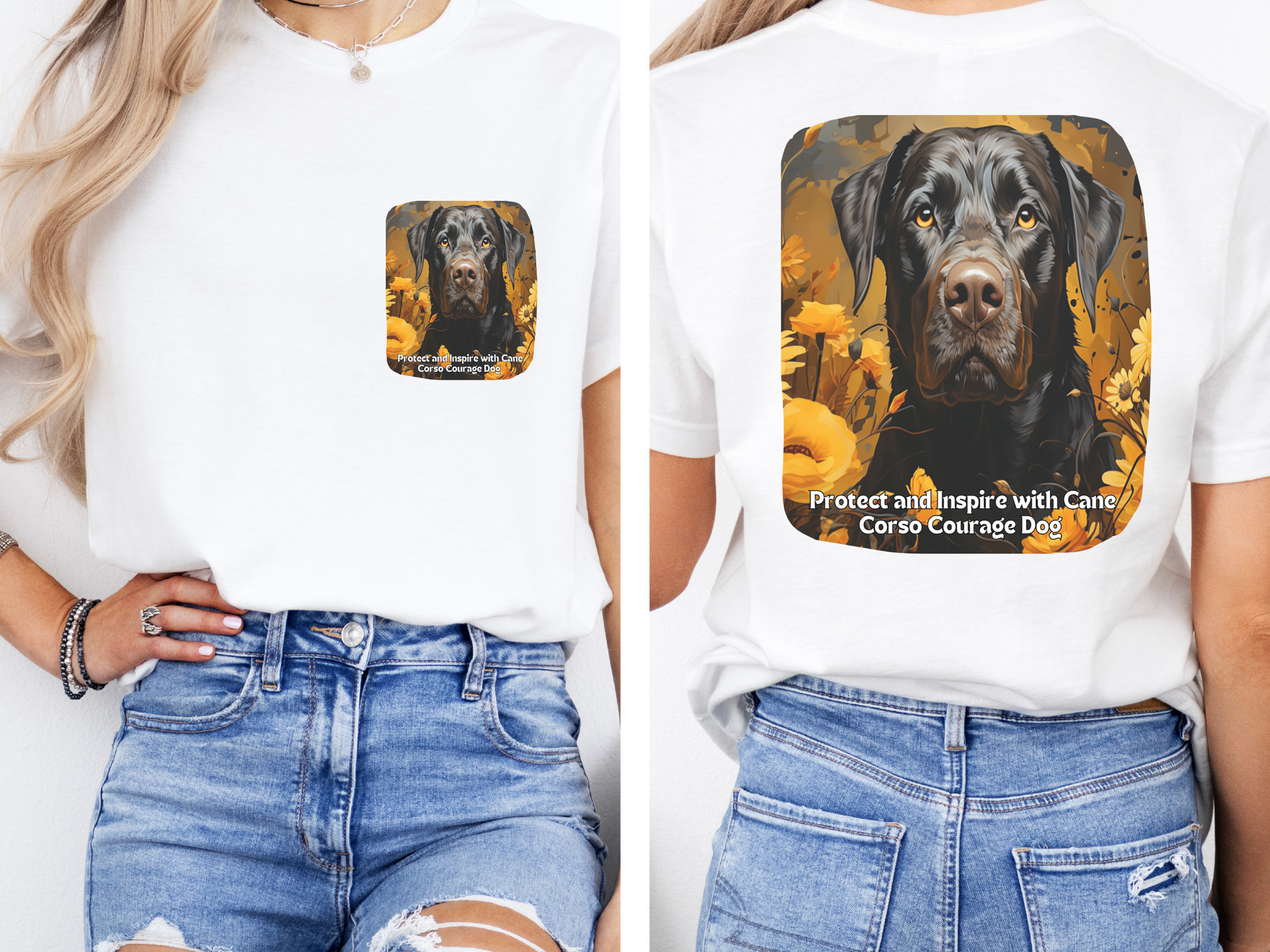 Celebrate the noble power of the Cane Corso with this commanding sunflower T-shirt! Featuring the bold slogan "Protect and Inspire with Cane Corso Courage" on the front and a majestic full-back design of a vigilant Corso standing guard among golden sunflowers, this tee embodies the breed's fearless loyalty, muscular grace, and heart of gold.