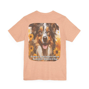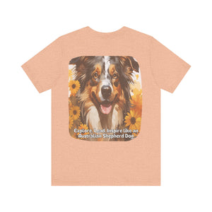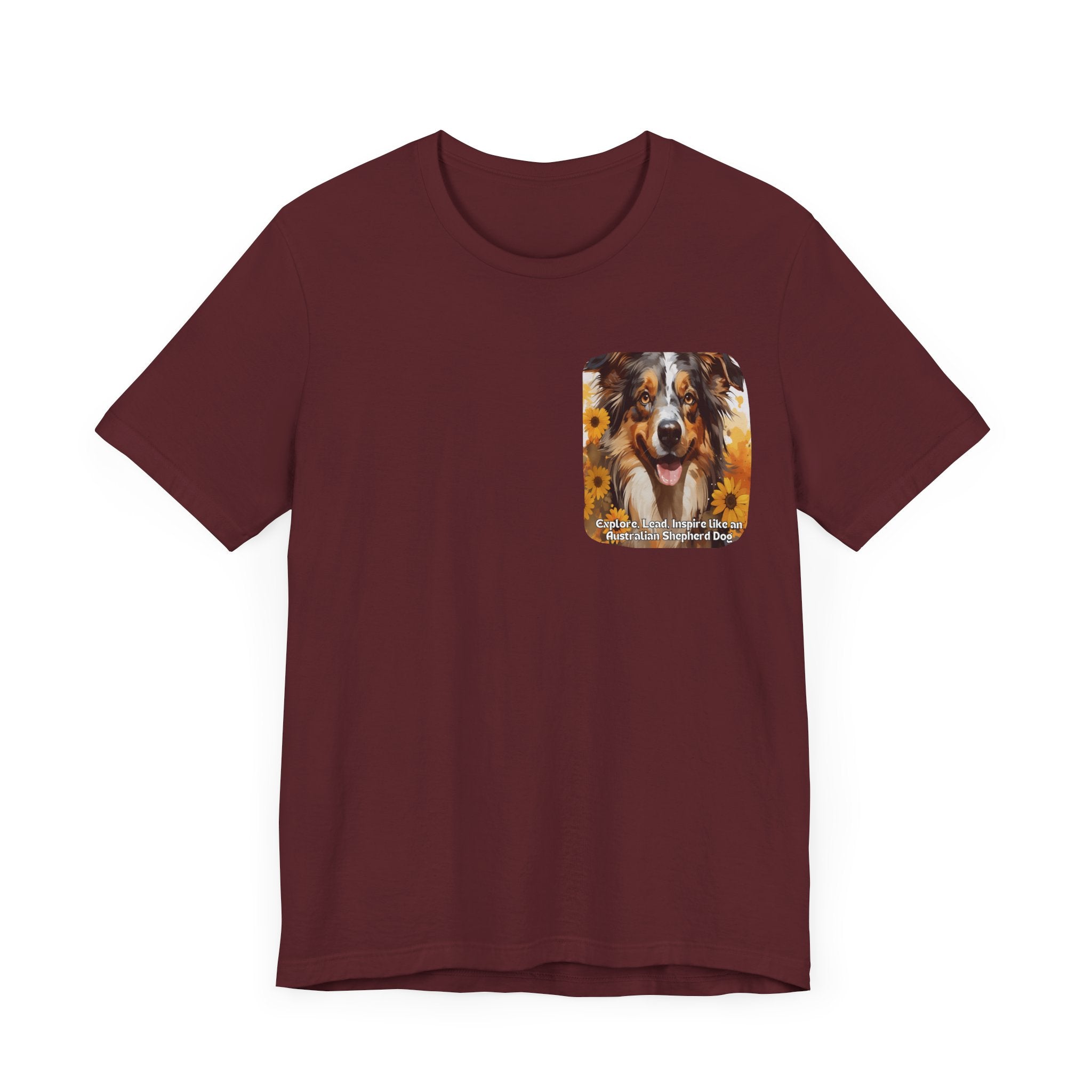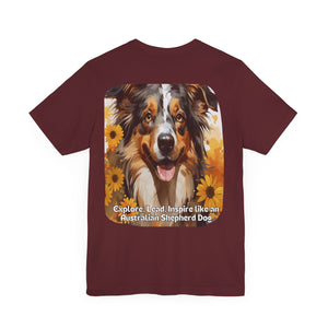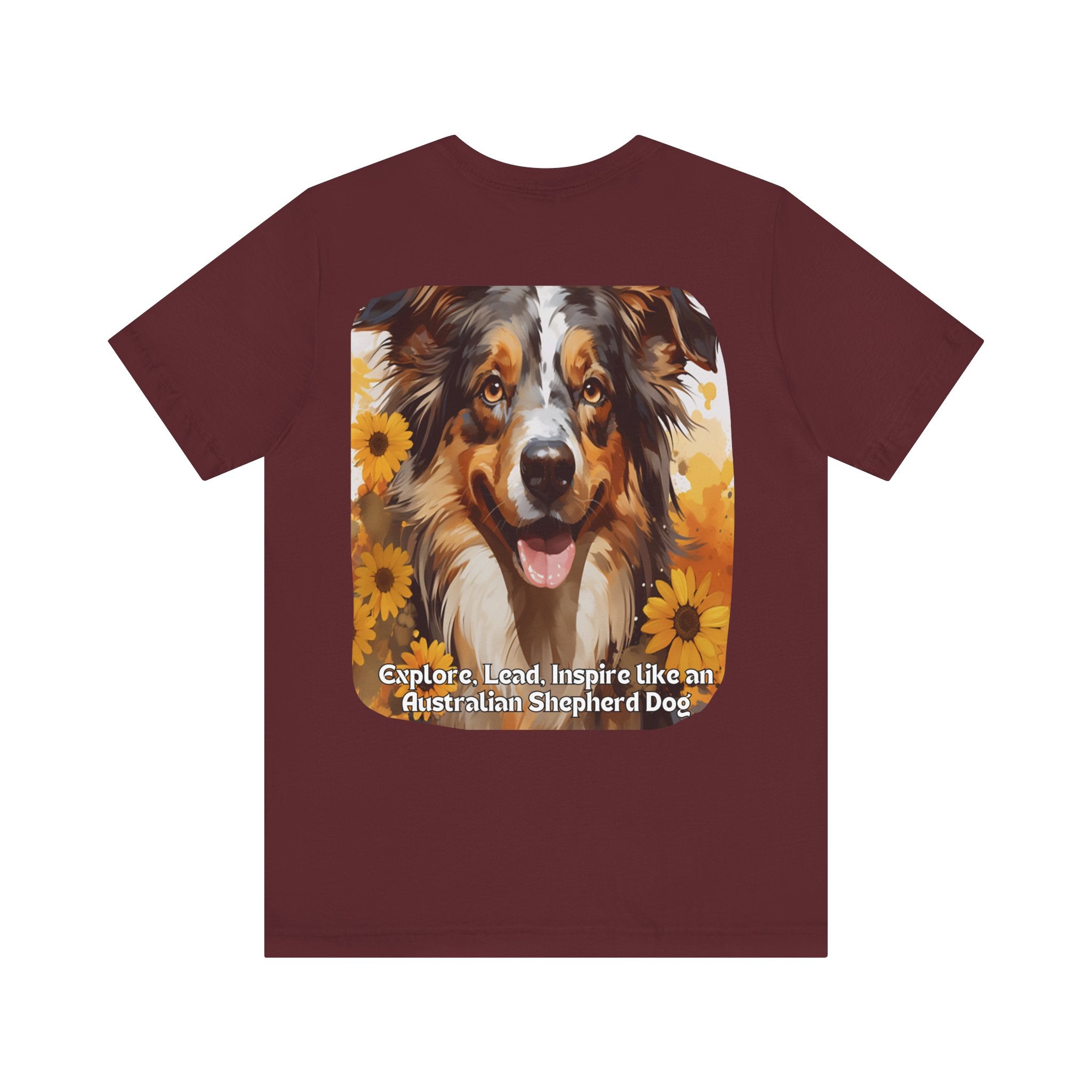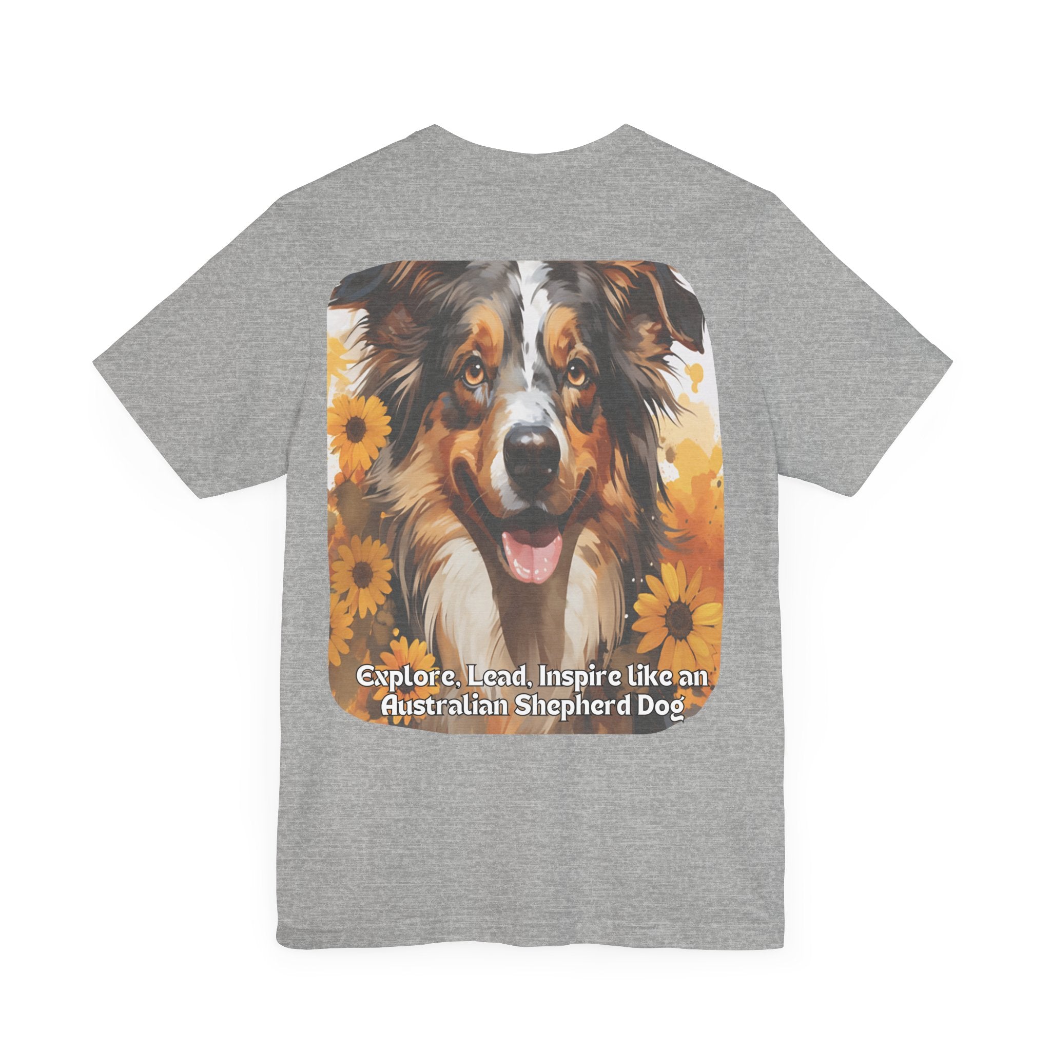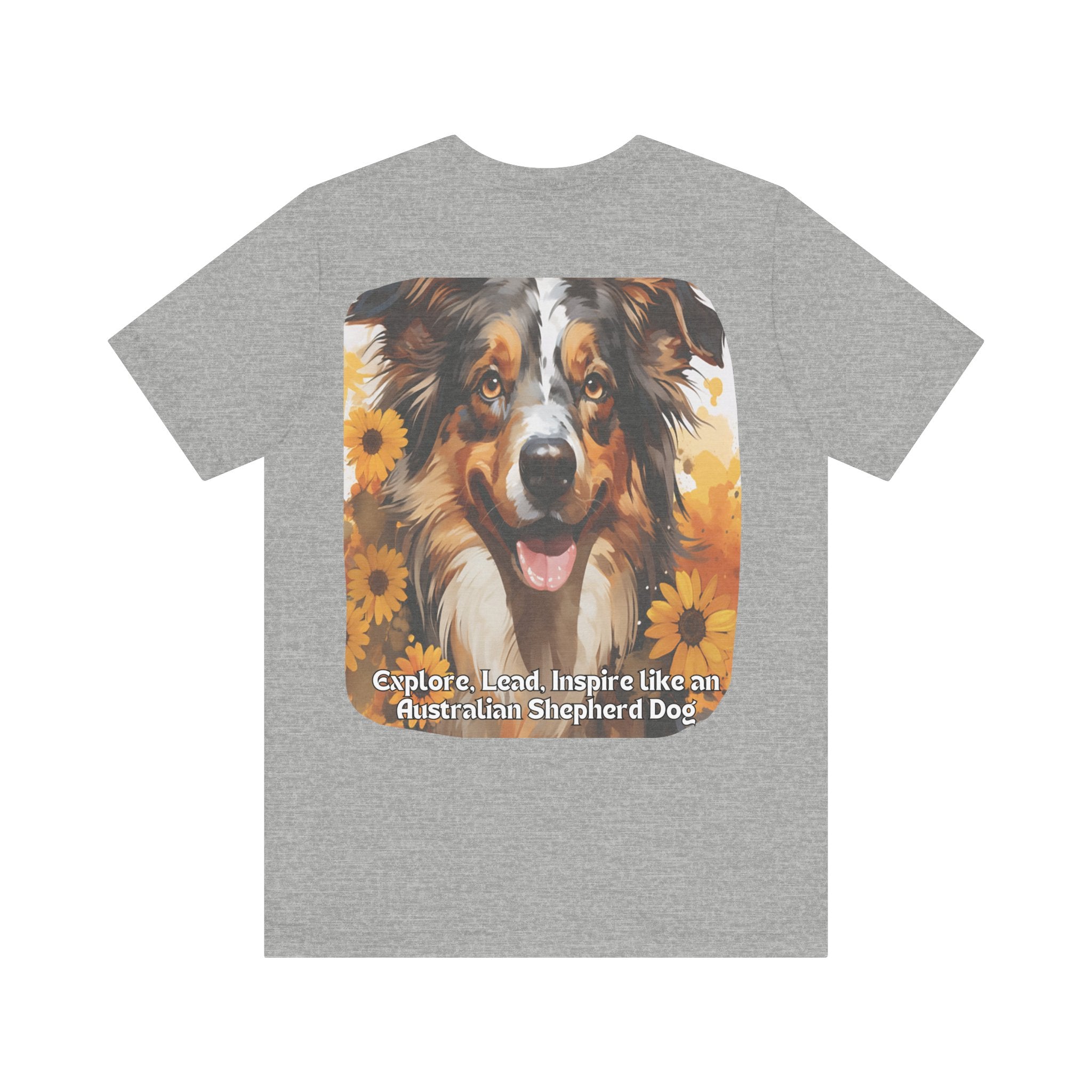 Copy of Australian Shepherd Sunflower T-Shirt – 'Explore, Lead, Inspire like an Australian Shepherd' – Front & Back Design – Energetic & Intelligent Dog Lover Tee