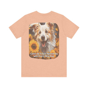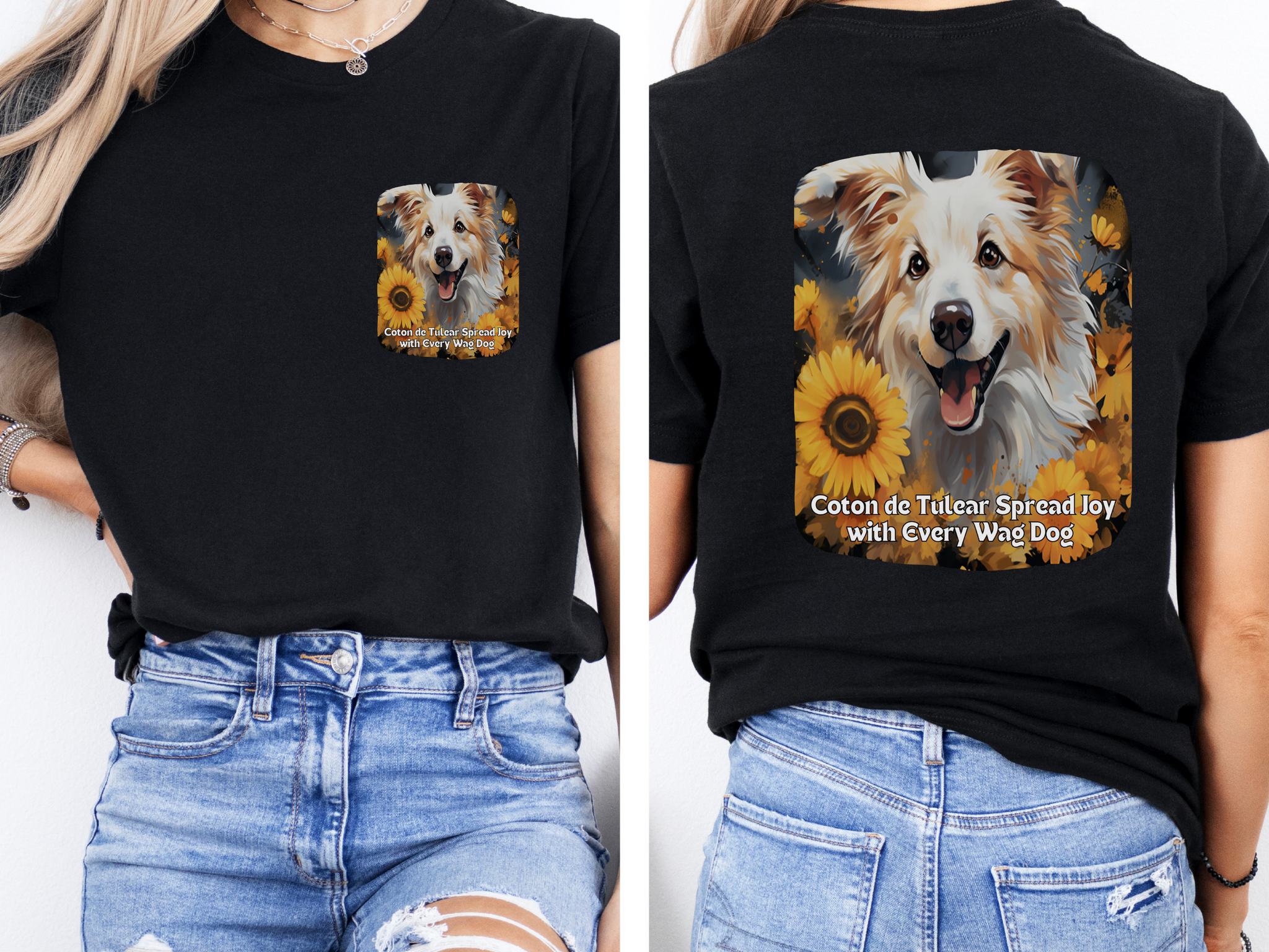Celebrate the sunshine personality of the Coton de Tuléar with this sunflower-themed unisex T-shirt! Featuring the heartwarming slogan "Spread Joy with Every Wag" on the front and a playful full-back design of a smiling Coton frolicking through golden sunflowers, this tee captures the breed’s signature cotton-like coat and endlessly cheerful spirit.
