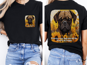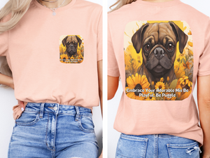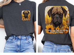 Celebrate the irresistible charm of Puggles with this sunflower-themed unisex T-shirt! Featuring the playful slogan "Embrace Your Adorable Mix: Be Playful, Be Puggle" on the front and a cheerful full-back design of a smiling Puggle romping through golden sunflowers, this tee captures the breed's perfect blend of Pug mischief and Beagle curiosity.