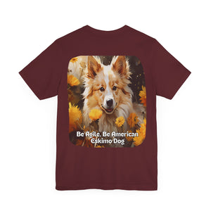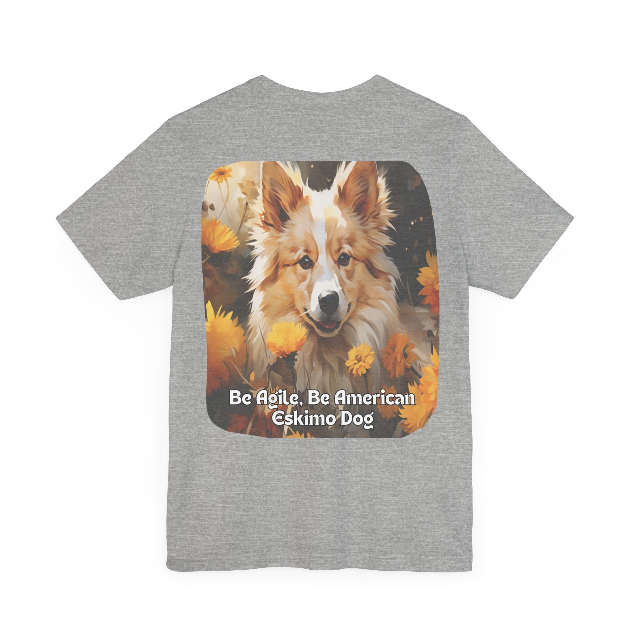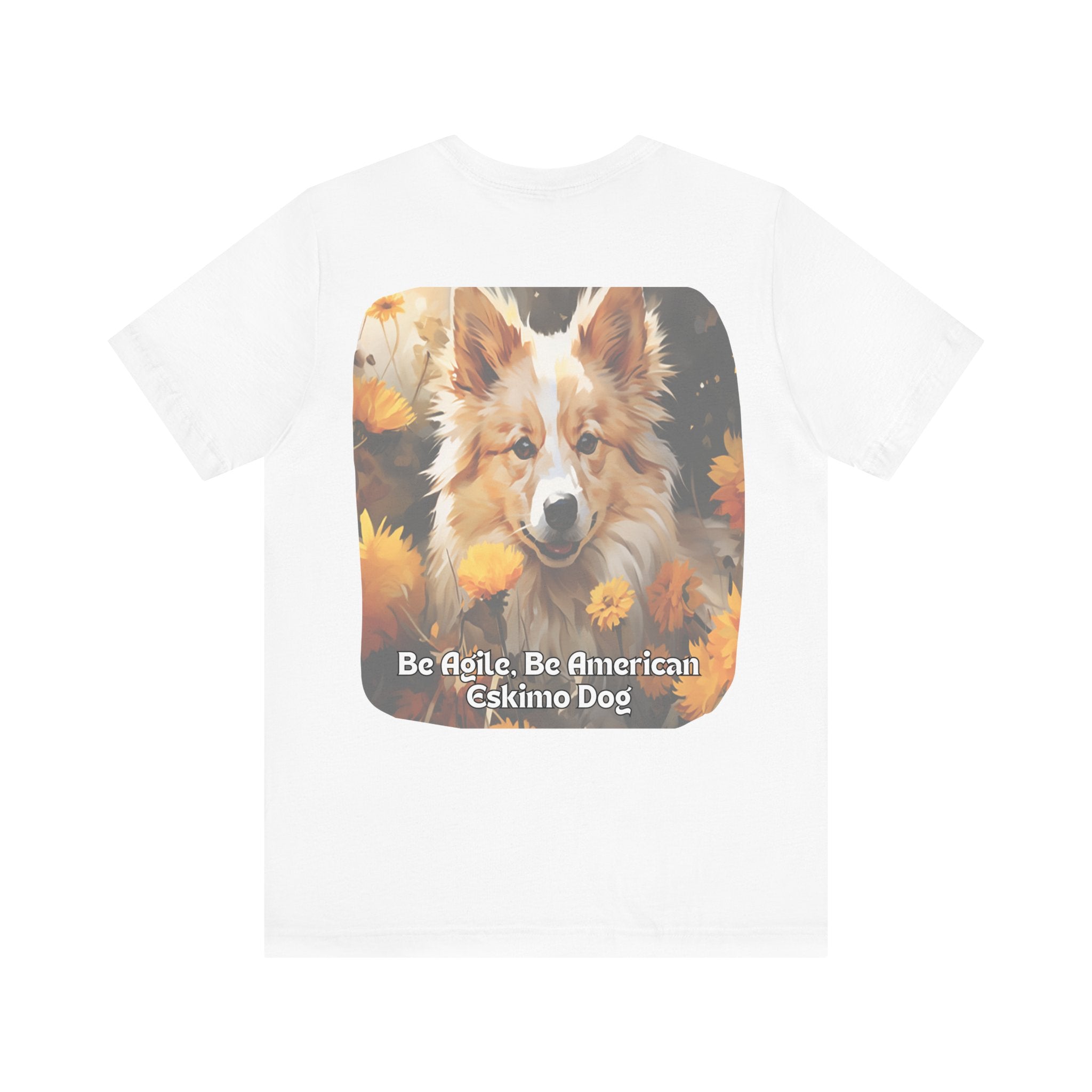 Celebrate the lively spirit of the American Eskimo Dog with this eye-catching sunflower-themed unisex T-shirt! Featuring the bold slogan "Be Agile, Be American Eskimo" on the front and a stunning full-back design of an Eskie surrounded by golden sunflowers, this tee is a must-have for fans of this energetic and intelligent breed.