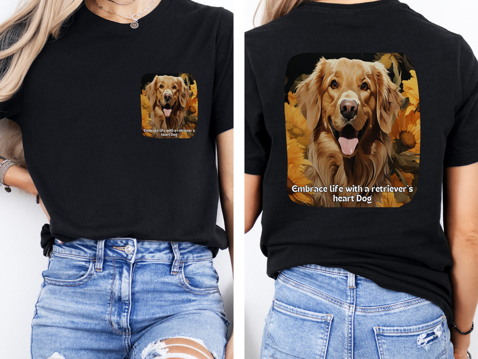 from $19.99 USDRetriever Sunflower T-Shirt – 'Embrace Life with a Retriever’s Heart' – Front & Back Design – Joyful Dog Lover Tee