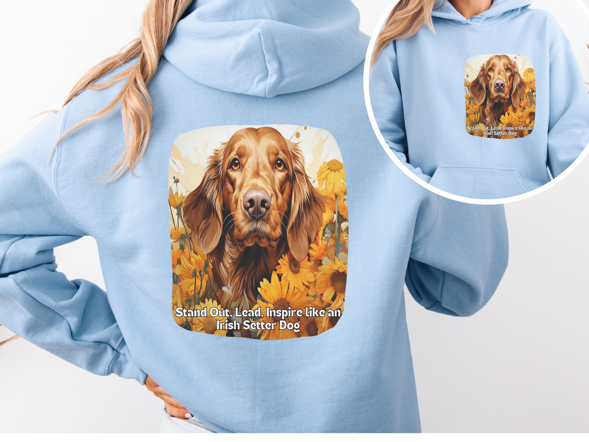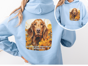Embrace your inner leader with this vibrant Sunflower Irish Setter Dog Unisex Hoodie! Featuring a bold, artistic design of a majestic Irish Setter surrounded by sunflowers, this hoodie carries the uplifting slogan: "Stand Out, Lead, Inspire like an Irish Setter Dog" on both the front and back.