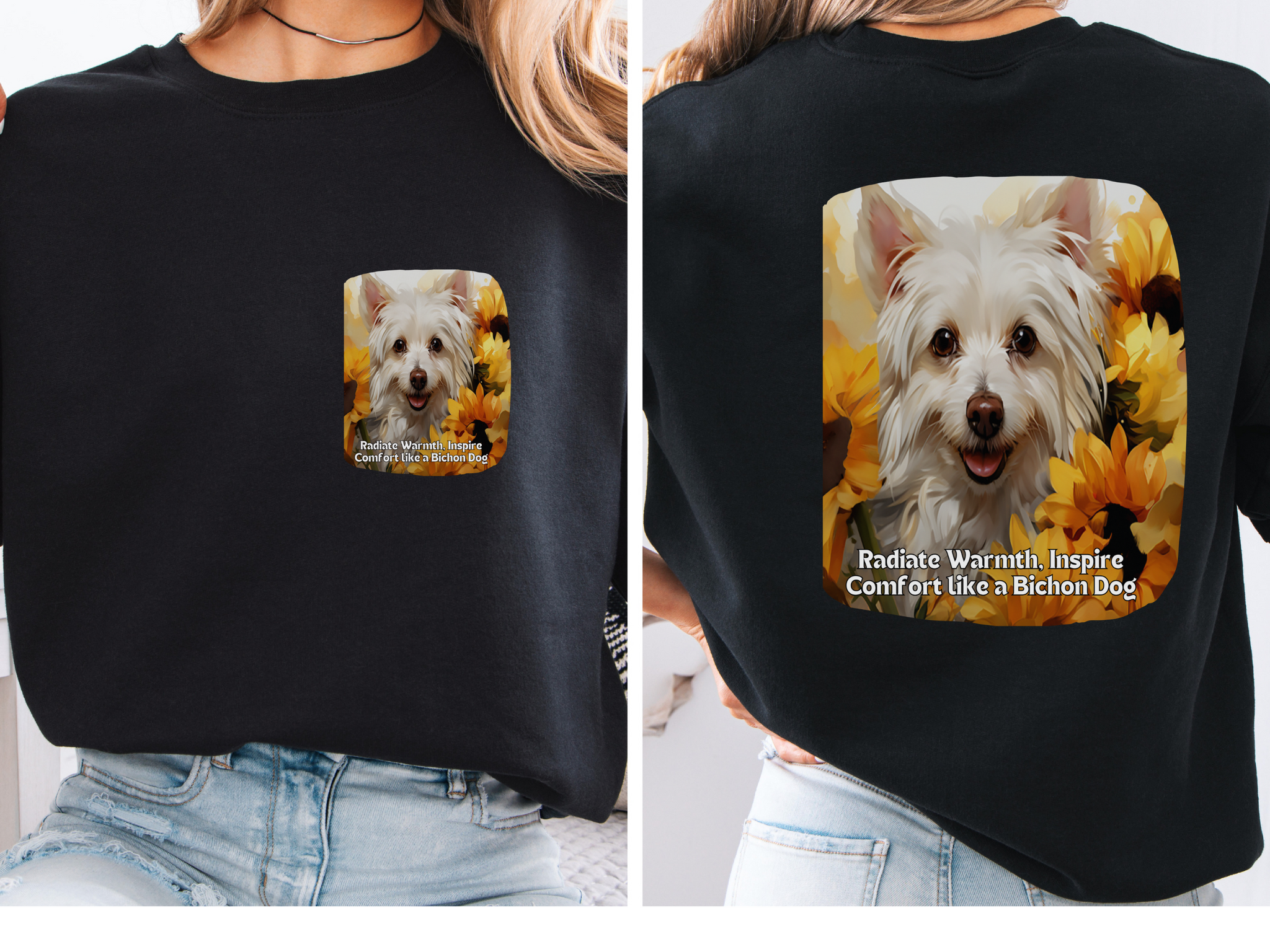 "Bichon Frise Sunshine Sweatshirt - 'Radiate Warmth, Inspire Comfort' - Sunflower Dog Lover Hoodie (Front & Back Print)"
