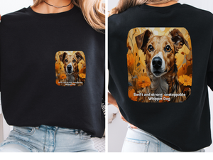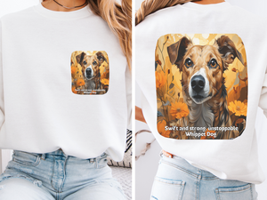 Channel the lightning-fast energy of your favorite sighthound with our Unstoppable Whippet Dog Sweatshirt! This eye-catching unisex pullover features a dynamic front-and-back print showcasing a sleek Whippet in mid-stride bursting through a vibrant sunflower, with our motivational slogan: "Swift and strong, unstoppable Whippet."