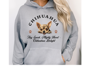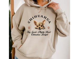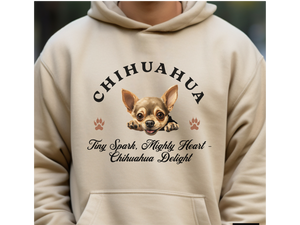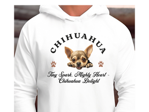 Celebrate the bold spirit of your pint-sized pup with this adorable Chihuahua Dog Hoodie, featuring the heartwarming slogan: “Tiny Spark, Mighty Heart – Chihuahua Delight.” Designed for the sassiest small dogs, this unisex hoodie is perfect for showcasing your Chihuahua’s fiery personality and loving heart.