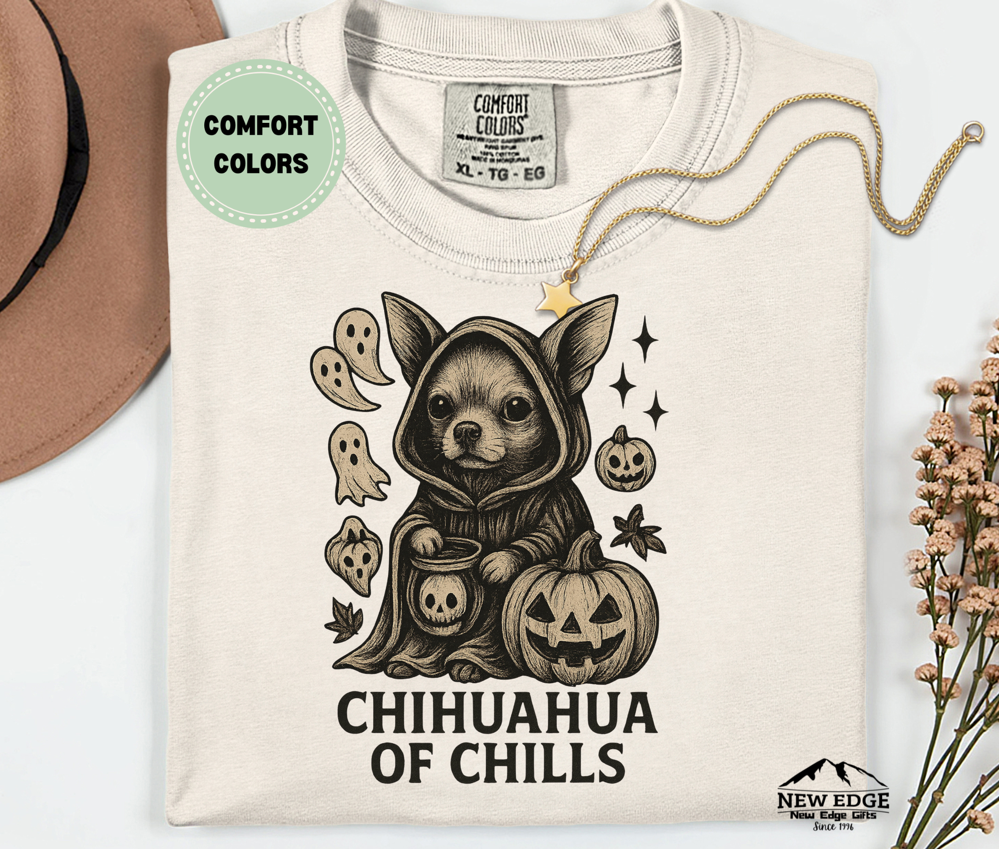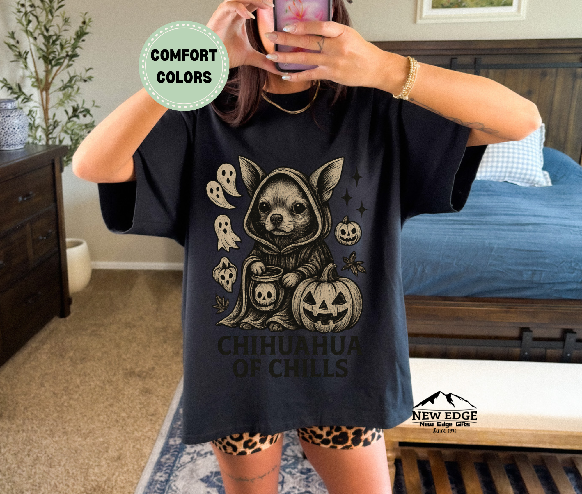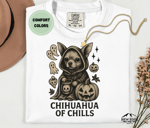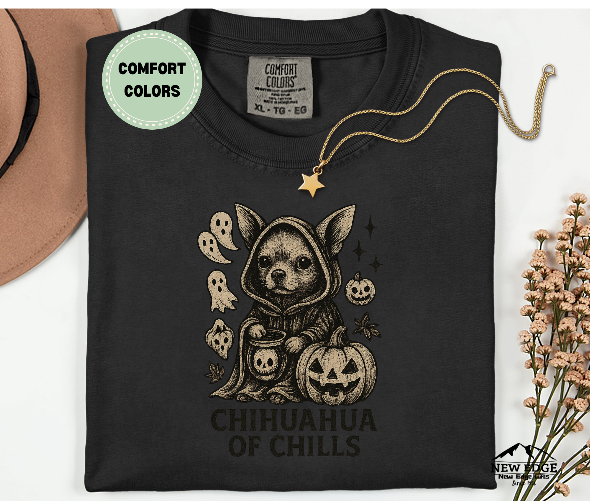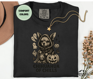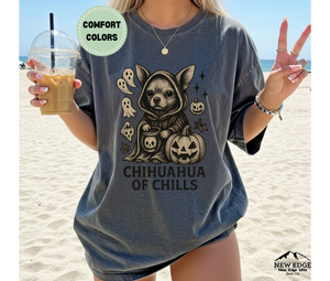 Bring some spooky charm to your Halloween wardrobe with our Comfort Colors “Chihuahua of Chills” T-Shirt. This unique unisex tee combines soft, vintage-washed Comfort Colors cotton with a playful Halloween twist featuring a chilling Chihuahua design. Perfect for dog lovers, Halloween fans, and anyone who loves a punny statement piece. Whether you’re heading to a haunted house, trick-or-treating, or just celebrating the season, this shirt adds comfort and frightful fun to any outfit.