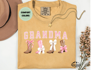 Celebrate grandma in style with this Comfort Colors GRANDMA T-Shirt featuring boots and bows. Perfect for the grandma who loves a touch of western charm, this tee pairs playful cowgirl-inspired details with cozy, soft comfort. Made from premium garment-dyed cotton, it offers a relaxed fit ideal for everyday wear, family gatherings, or casual outings.