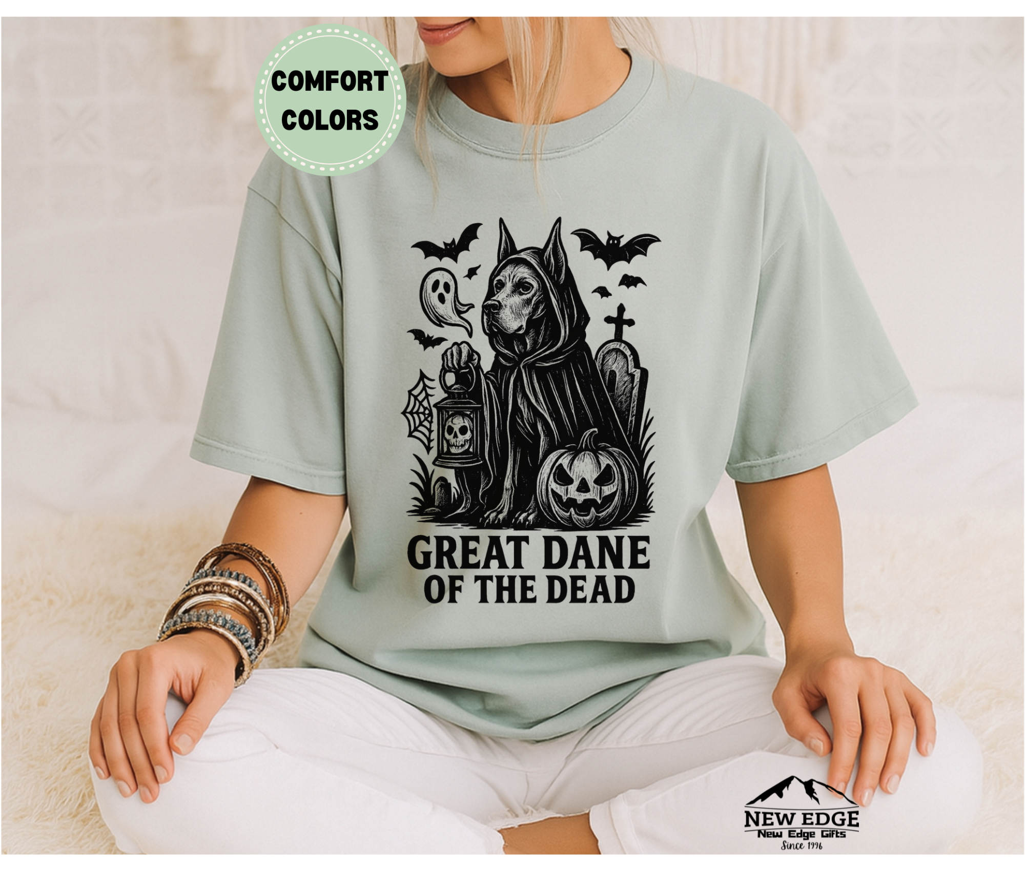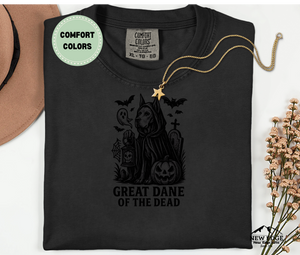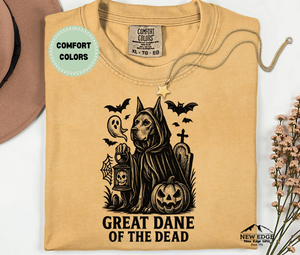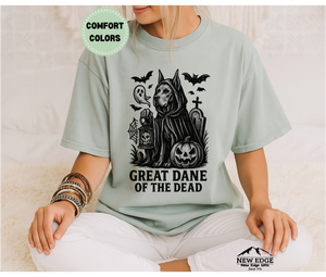 Unleash the fright with our Comfort Colors “Great Dane – Of The Dead” T-Shirt. This Halloween-ready unisex tee combines the bold presence of the Great Dane with a playful spooky pun, making it the perfect choice for dog enthusiasts who love the haunting season.