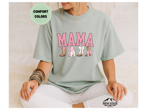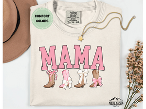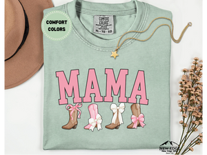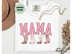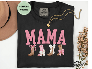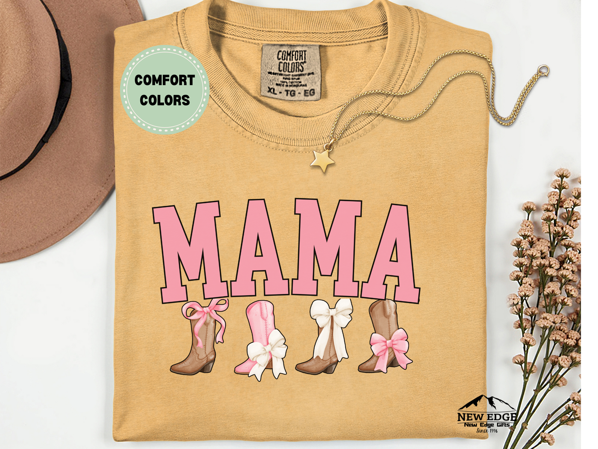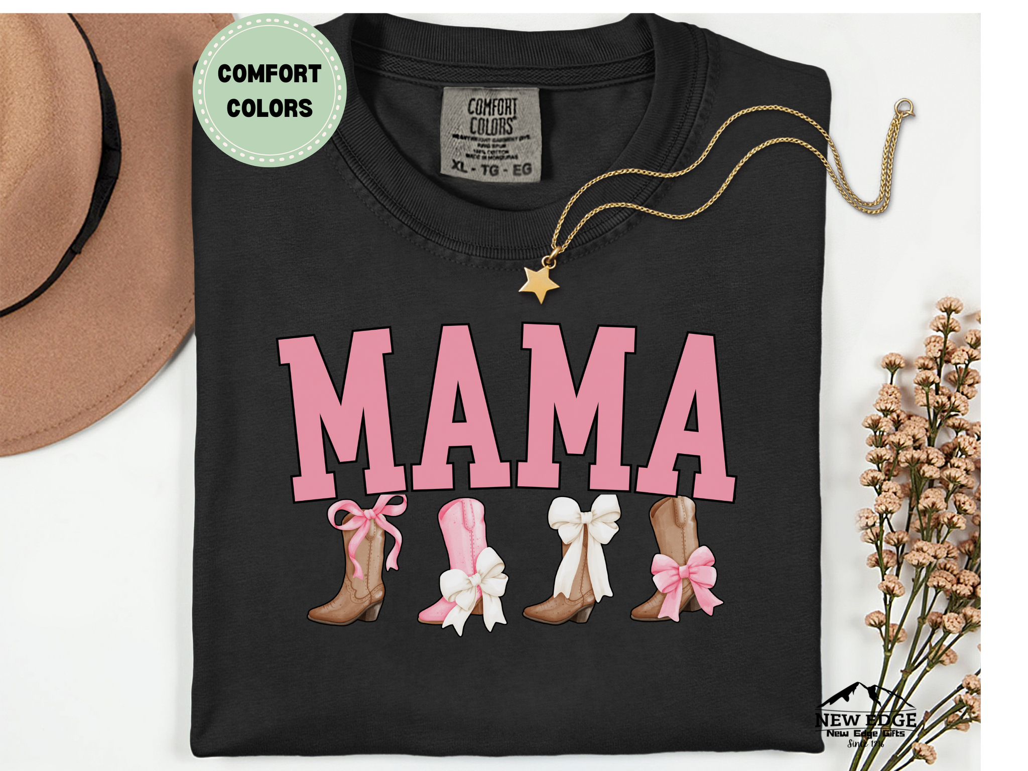 Comfort Colors MAMA Boots and Bows T-Shirt – Western Cowgirl Mom Graphic Tee, Cute Mama Shirt