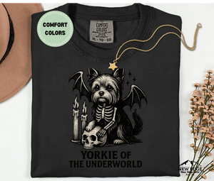 Step into the shadows of spooky season with the Comfort Colors “Yorkie of the Underworld” Halloween T-Shirt. This playful unisex tee combines the sass of a Yorkshire Terrier with a chilling Halloween pun, making it the perfect choice for Yorkie lovers who want to celebrate the season in style.