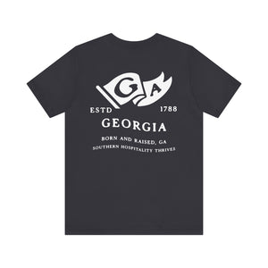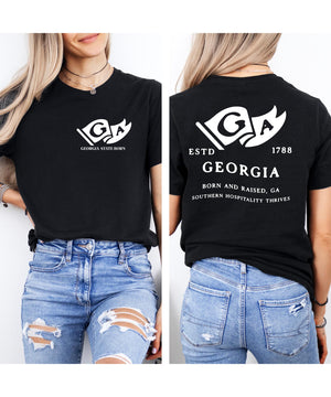 Southern Born, Georgia Strong." Show your Georgia pride with this Born & Raised T-shirt, featuring a bold front and back design that celebrates your deep roots in the Peach State. Made from soft, breathable fabric, this tee is perfect for everyday wear—whether you're strolling through Atlanta, enjoying sweet tea on the porch, or repping Georgia at a game. A must-have for proud Georgians and a great gift for anyone who calls the South home