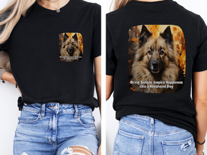 Celebrate the joyful spirit of the Keeshond with this sunflower-themed unisex T-shirt! Featuring the heartwarming slogan "Bring Smiles, Inspire Happiness like a Keeshond" on the front and a stunning full-back design of a smiling Keeshond framed by golden sunflowers, this tee embodies the breed’s cheerful personality and loyal companionship.