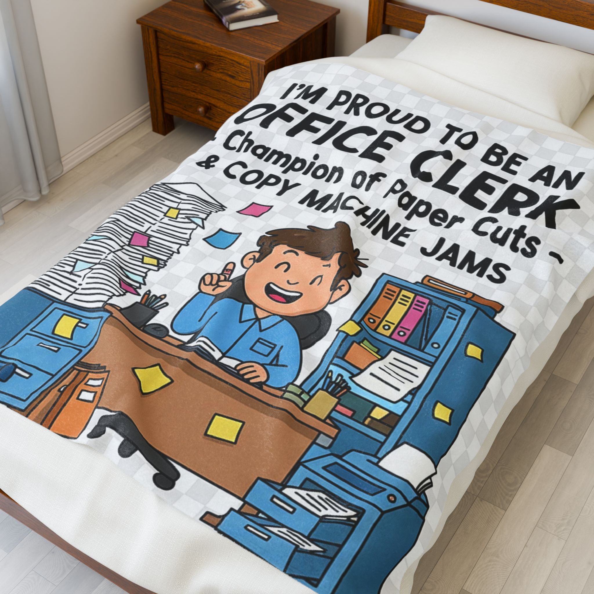 Celebrate the unsung heroes of the office with this ultra-soft velveteen blanket! Featuring the witty slogan “I’M PROUD TO BE AN OFFICE CLERK – Champion of Paper Cuts & Copy Machine Jams”, this cozy throw adds humor to the daily grind. Perfect as a funny and thoughtful gift for clerks, admins, or office staff who keep things running smoothly. Designed by New Edge Gifts & Novelties, this profession blanket is a playful mix of comfort and workplace pride.