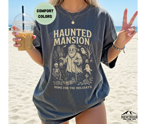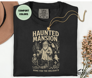 Celebrate the holidays with a spooky twist in the Unisex Comfort Colors Haunted Mansion Home for the Holidays Halloween T-Shirt. This one-of-a-kind gothic design blends eerie haunted mansion artwork with festive details, paired with the chilling slogan “Home for the Holidays.”
