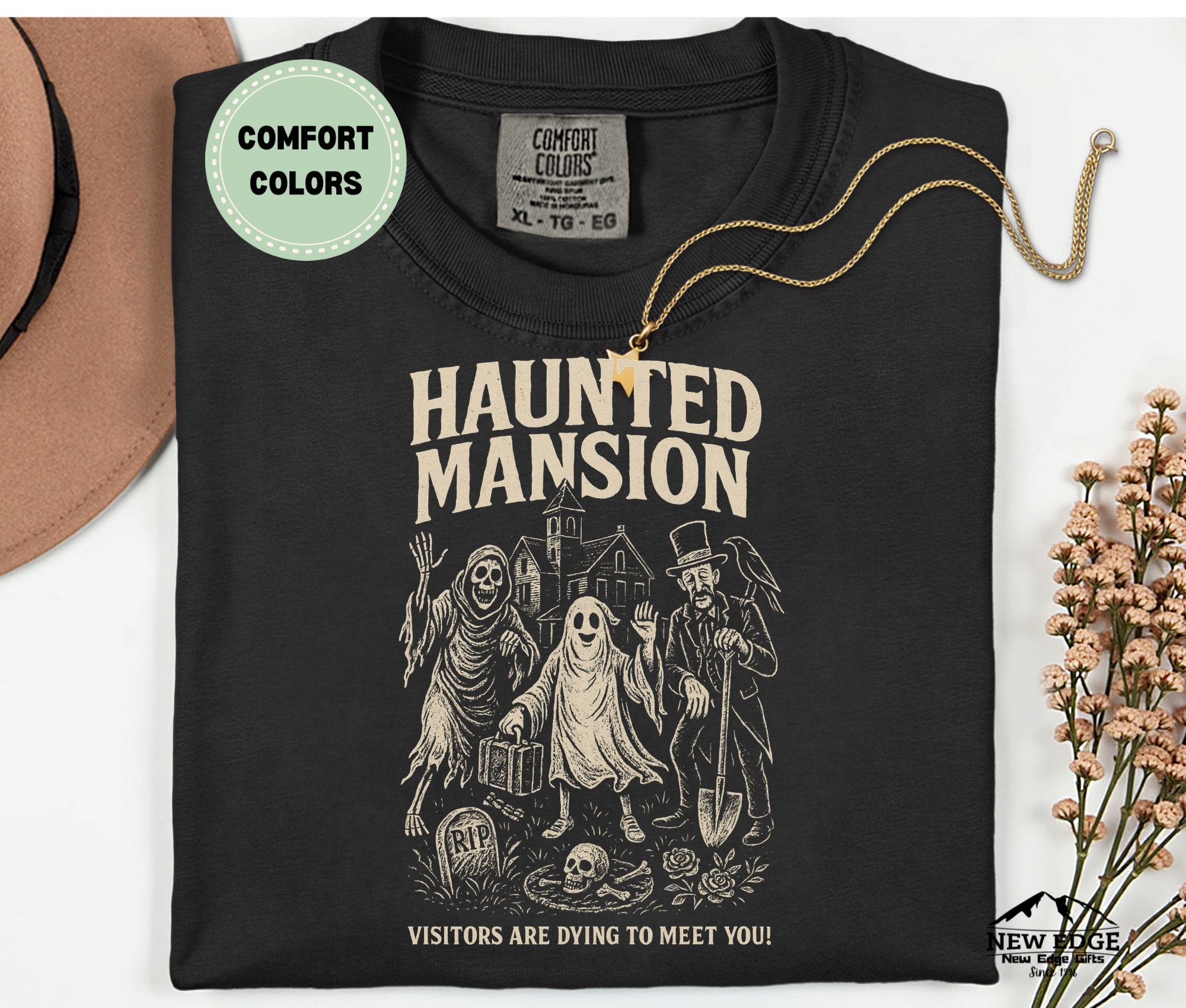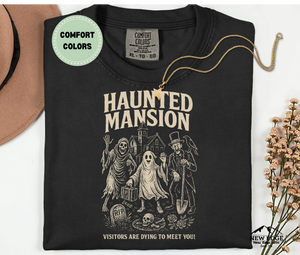 Step into spooky season with the Unisex Comfort Colors Haunted Mansion “Visitors Are Dying to Meet You” T-Shirt. This eerie design features a haunted Victorian mansion surrounded by tombstones, twisted trees, and ghostly figures, paired with the chilling slogan “Visitors Are Dying to Meet You.”
